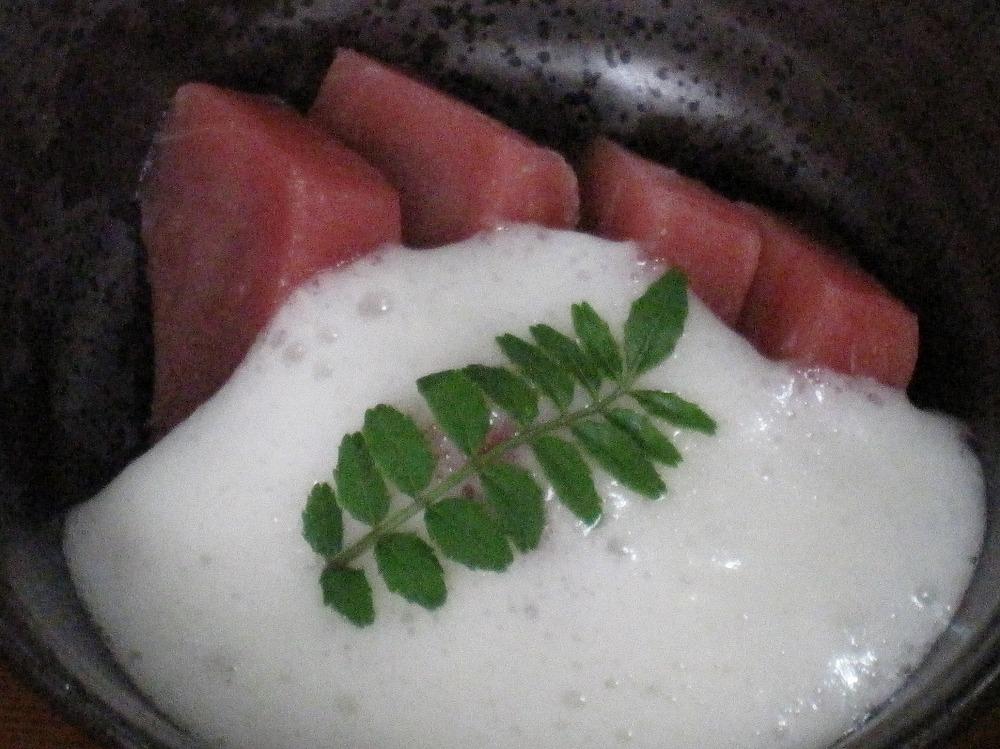 自然薯の中心部のみ使用し、出汁だけで味付けしたマシュマロのような「はかた白とろろ」は、お好みのお味で召し上がってください。