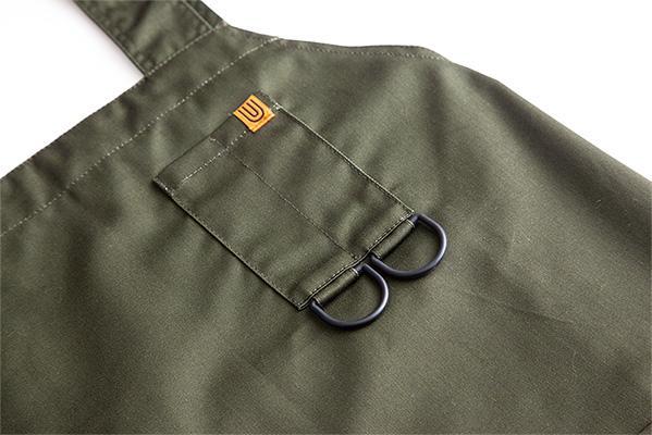 腹部にある大きなフロントポケットは、マチ付きなので厚みのある物などが入る大容量。胸元にはペン挿しになるポケットや、鍵などをかけられるDループが2つついたりと機能性に優れたエプロンです。