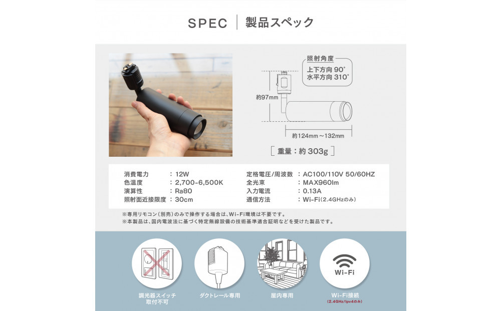 一般家庭はもちろん、店舗・ギャラリー・ディスプレイ照明など、幅広いシーンに対応する多用途モデルです。