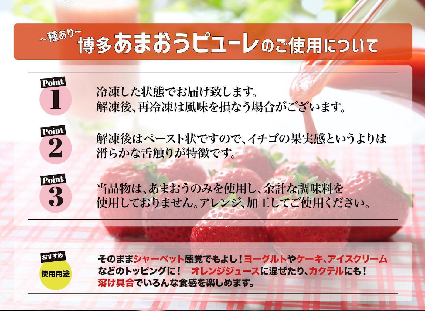 「あかい・まるい・おおきい・うまい」が名前の由来である「博多あまおう」福岡県産の高級品種「あまおう」を贅沢に100%使用したピューレです。