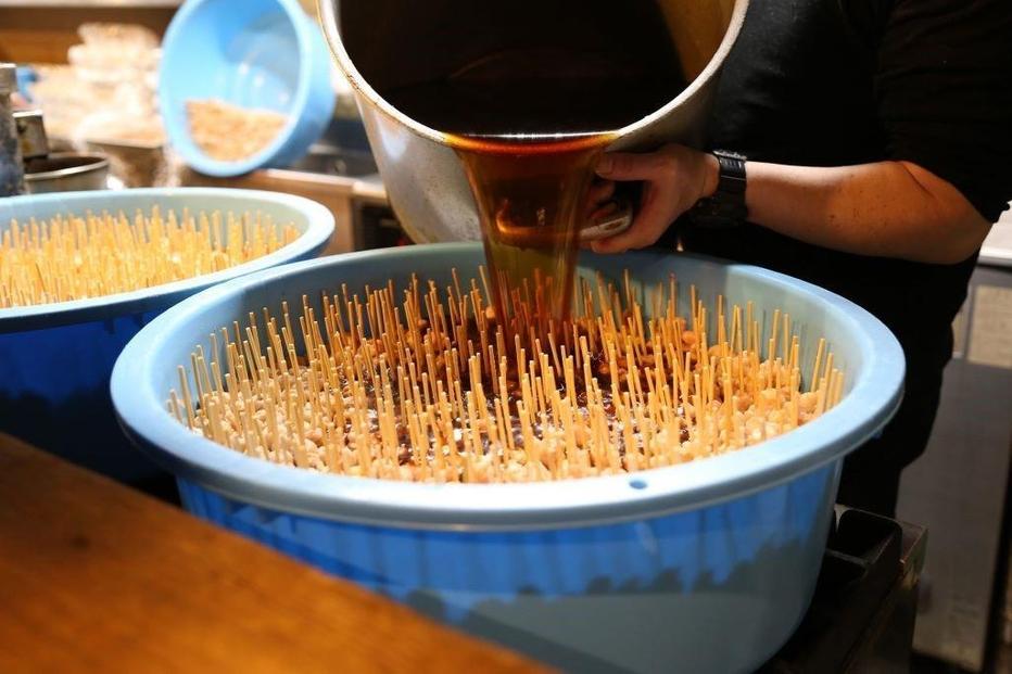 1日1日焼いては寝かせを繰り返して、6日間掛け仕上げる「かわ屋のとり皮」は、余分な脂を落とし、うまみを凝縮する事によって、食べた際に、脂っこくなく、口の中に広がるバターの様な風味が特徴で、ついスナック菓子のように何本も食べれちゃうのが特徴です。
