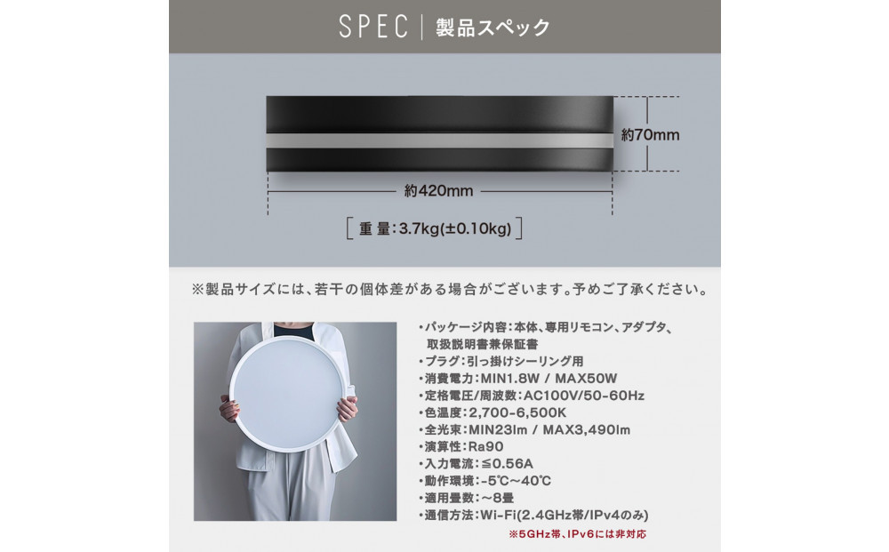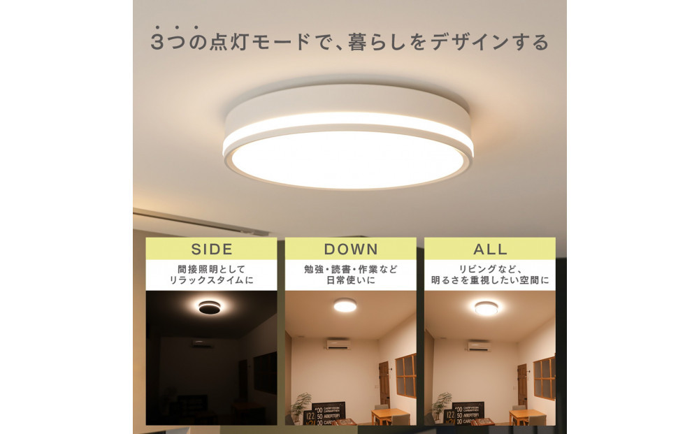 側面のみ点灯時は光源が直接目に入らず眩しくないため、常夜灯や授乳ライト、ナイトライトとしても最適。白い昼光色から温かみのある電球色までの調色、0~100%の無段階調光に対応しており、8畳相当の明るさながら調光機能により4〜7畳でも使いやすく、省エネ・節電にも効果的です。