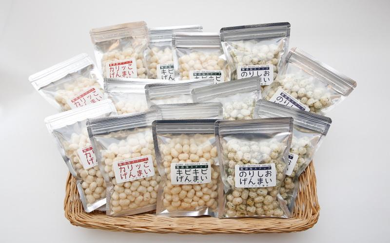 お米の素の味が楽しめるカリっこげんまいときび砂糖味のキビキビげんまい、ほんのり甘いのりしおげんまいが5個ずつ入っています。