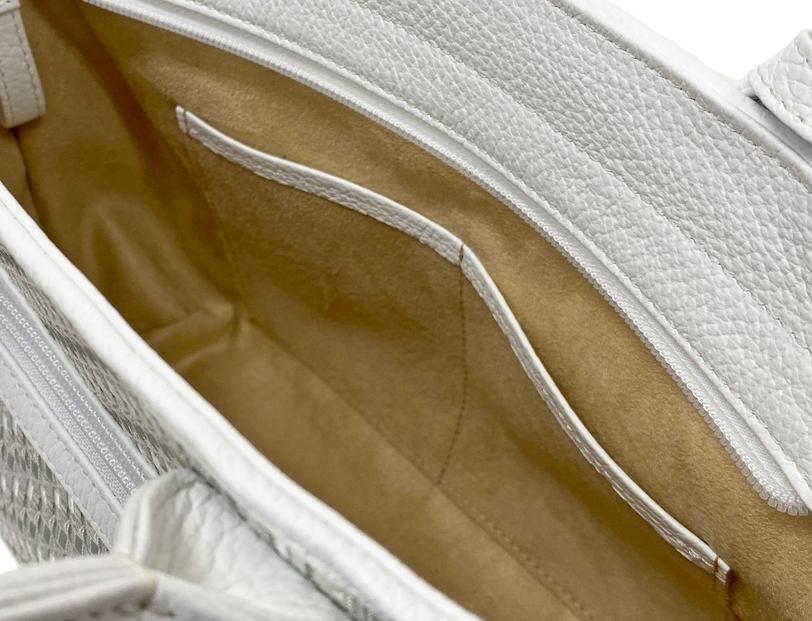 機能性も重視したデザインで、両サイドにはスマホを入れる事のできるオープンポケットつき。また、貴重品を安心して入れる事の出来るファスナーポケットも前後にあります。底鋲つきなので置きやすさも抜群。