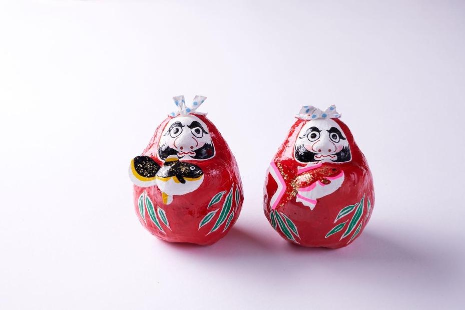 縁起物「鯛・ふく」を抱き、背には「にわか面」を付けて豆しぼりのダルマが「博多どんたく」を祝います。