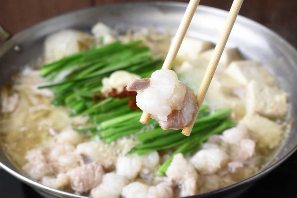 「丸腸もつ鍋」は、新鮮な国産丸腸と、丁寧にとったかつお出汁、ちょっと甘めでコクのある醤油がベースとなっています。元々はまかないから生まれた人気の丸腸もつ鍋、店舗では食べられないまぼろしのもつ鍋として人気です。