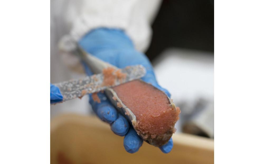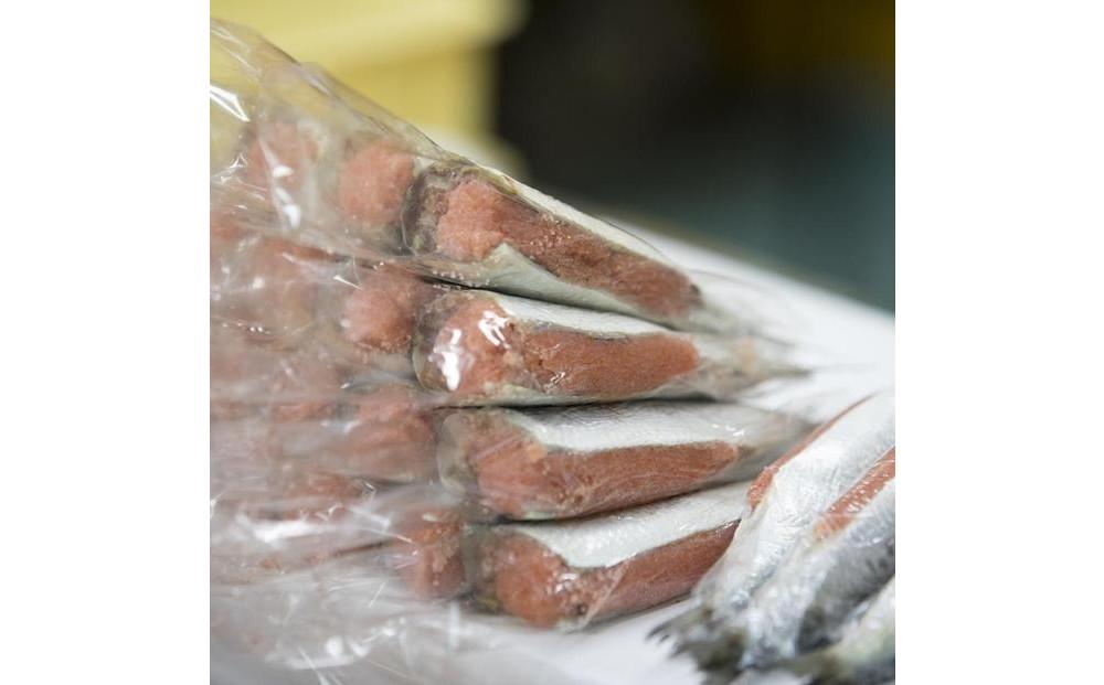良質ないわしのお腹にほどよい辛さの明太子の粒がぎっしり詰まっています。