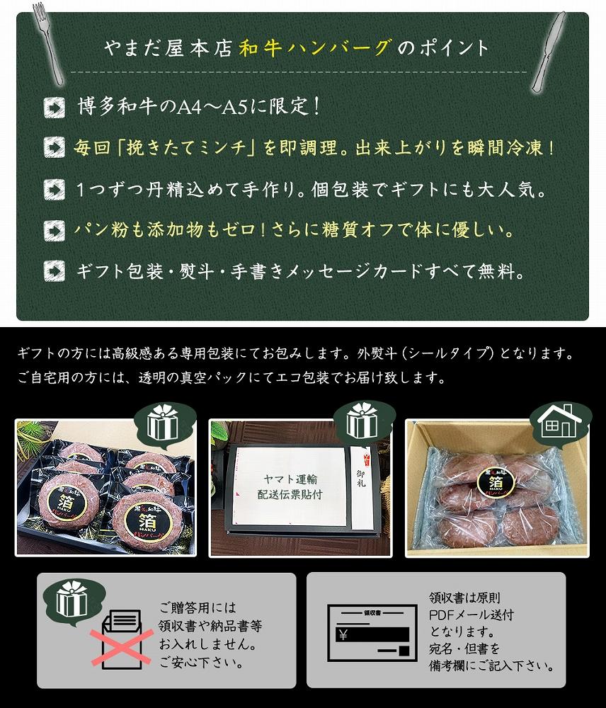 創業85年の老舗精肉店だからこそできる、捌きたての博多和牛で1つずつ丁寧に作っている特製和牛ハンバーグ【箔】です。