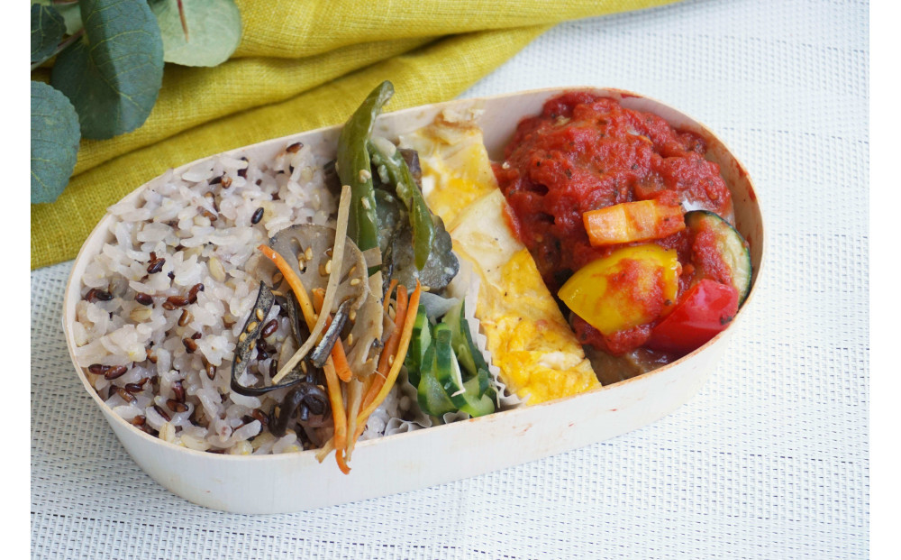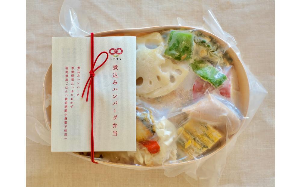ハンバーグは野菜と旨みたっぷり、ひとつひとつジューシーに焼き上げ、季節のソースで煮込みました。薬膳の考え方をとりいれ、夏は「体の余分な熱を冷ます」ことをテーマに、有機トマトソースで煮込み、夏野菜のラタトゥイユを添えています。スパニッシュオムレツのベーコンは、うぶすなキッチンで、塩漬けから燻製まで手仕事でおつくりしています。