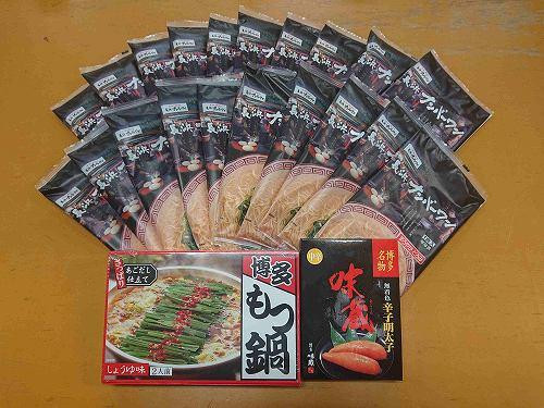たっぷり福岡の味が楽しめる豚骨ラーメン20食と、明太子150gと、もつ鍋をセットにしました。