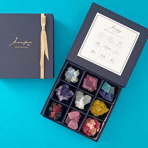 こうぶつヲカシの名前の由来の1つである ”鉱物みたいなお菓子 ”を代表する作品で、全てがリアルな鉱物を模しており、理想の形を目指して作りあげました。ハラペコラボの渾身の一箱です。
