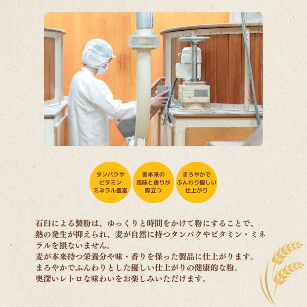 石臼で碾いた小麦粉を30%ブレンドしました。ロールで製粉した小麦粉に比べて、小麦の皮に近い部分が含まれるため、小麦粉も、焼いたパンも小麦色になります。焼きたての香ばしい香りや、口溶け、歯切れがよく、サクミある食感が特長のパンが出来ます。