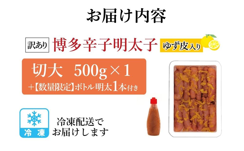 いまだけ数量限定!ゆず皮入りの辛子明太子に、ギュッと絞ってそのまま白いご飯にはもちろんアレンジ料理にも使えるボトル入り明太子が1本(230g)付いてきます!