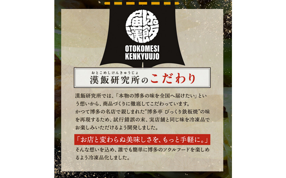 セットにはお肉・にんにく・ラード・特製辛味噌などがすべて入っており、キャベツをご家庭でご用意いただくだけ。シンプルな調理工程で、本格的な博多の鉄板焼きを楽しめます。
