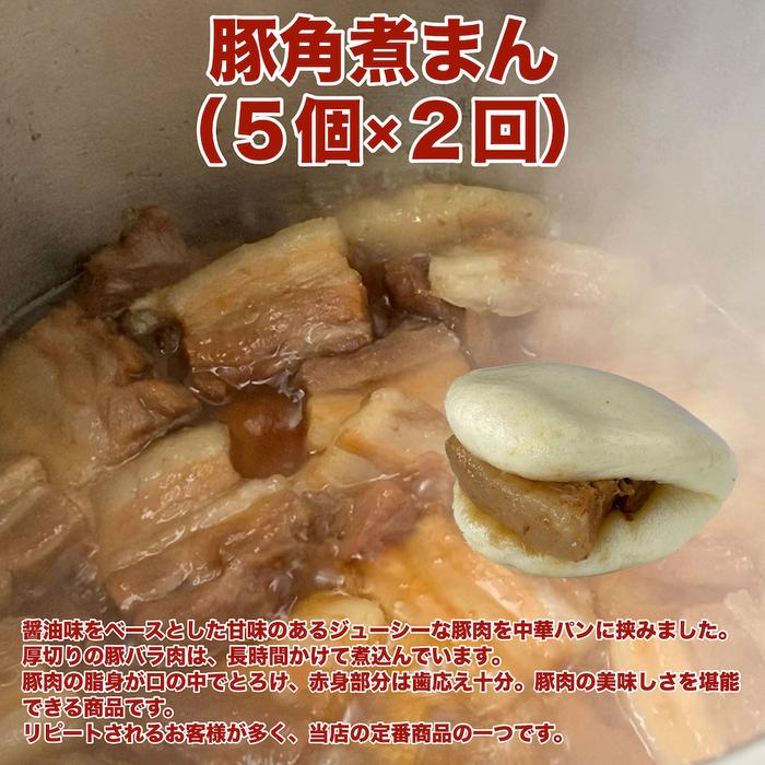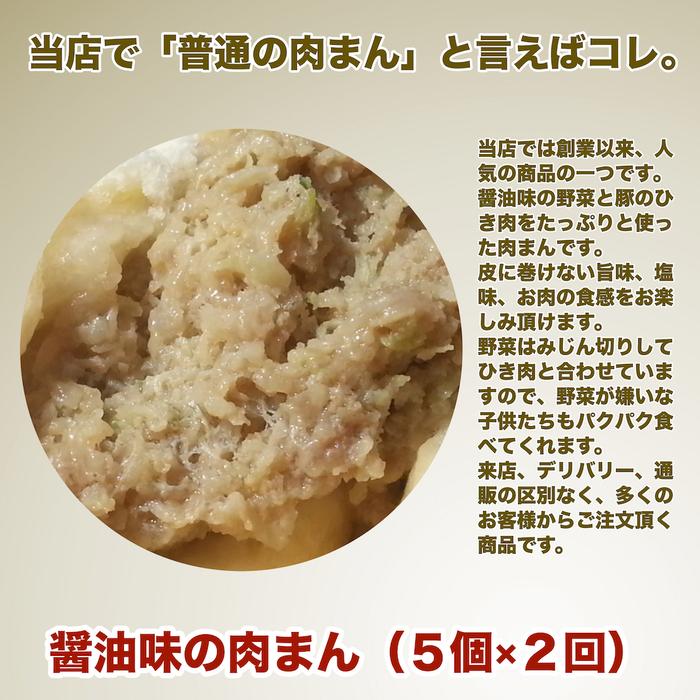 当店一番人気の醤油味の肉まんと豚角煮まん、各5個(計10個)を2回お届けします。 余った商品を冷凍保存した場合は、自然解凍してから蒸し器や電子レンジで温めて頂くと、おいしくお召し上がり頂けます。 【製造場所】福岡市城南区別府5-13-30 事業者名:中華パンの専門店 福慶 連絡先:092-980-5023