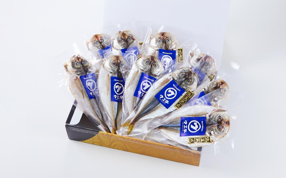 数多く水揚げされる「真あじ」。年中水揚げされ美味しく食べられます。味が凝縮されていて旨味が強く、干物に向いてる手のひらサイズの大きさが中心となります。脂ののり、鮮度、サイズを仕入れ人が厳選して仕入れます。ウエダ自慢の一品を是非お召し上がりください。