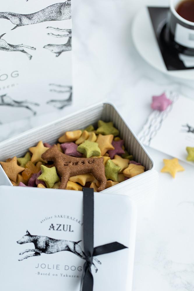 缶に詰め込んだ星型クッキーの中に、ごほうび犬が入っています。