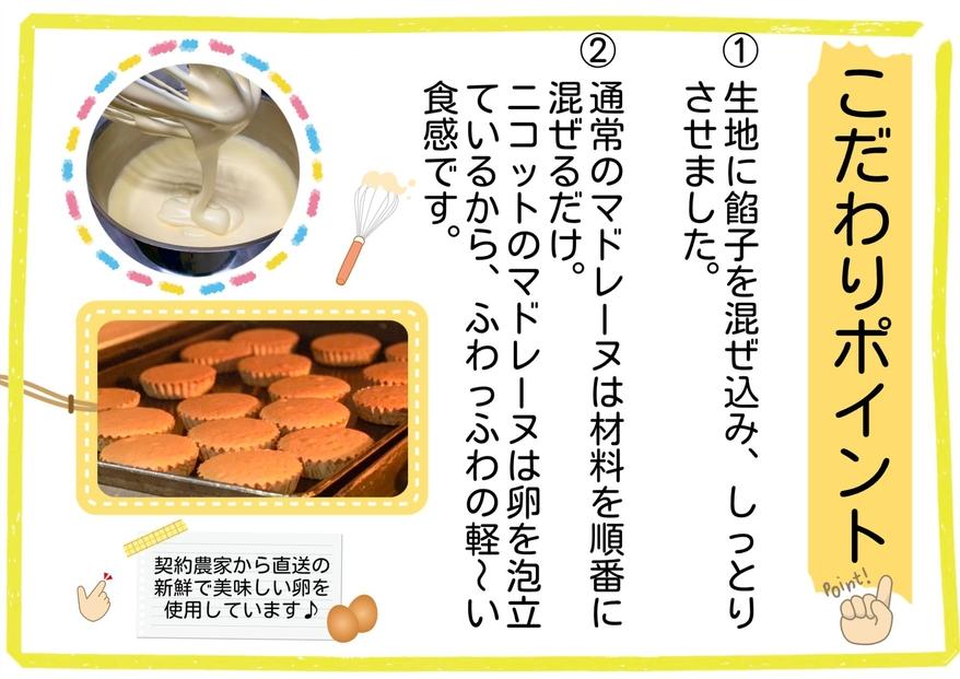 しっとり、フワッと軽くて、どこか懐かしい味がする、パティスリーニコット自慢のマドレーヌです。