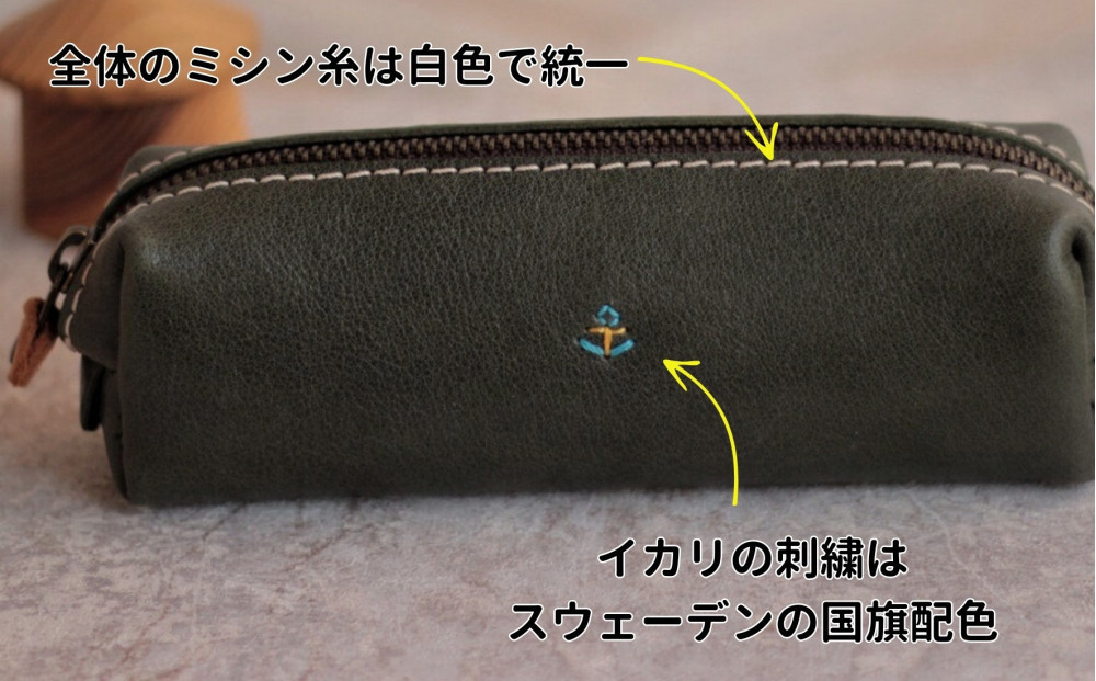 定番BOXペンケース【Sサイズ】 |製品サイズ・スペック 幅17cm 高さ5cm 奥行5cm 重さ70g(なす1本分) ★より小さい【XSサイズ】、ひとまわり大きい【Mサイズ】も出品中 ミシン糸色:本体革色問わず白糸(革製品専用糸) 手縫い刺繍:水色×黄色×水色(スウェーデン国旗カラー) 金具類:鉄(アンティークゴールド) 裏地:無し(本革1枚仕立て) ◆グリーン:上品で深みがある緑色 ※色の選択欄が無い場合、検索窓で japlish と入力すると他の革色がご覧いただけます。 ※画像の色と実際の色に多少
