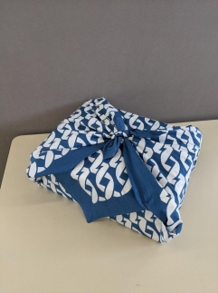 綿100%の100cm角の風呂敷です。結び方次第で、お包は勿論、エコバックやおしゃれバックに変身します。図柄は、博多祇園山笠の昇縄(かきなわ/担い綱)をイメージし、そこに福博(フクハク)の文字をデザイン化して制作しました。綿100%ですので、汚れてもご家庭の洗濯機で丸洗い可能です。 事業者名:(有)戸次染工場 連絡先:092-621-2718