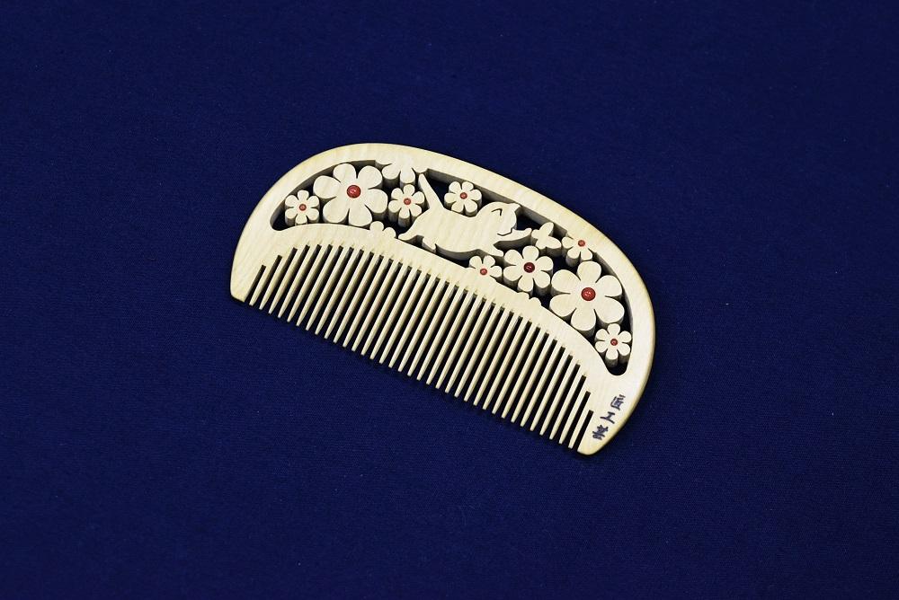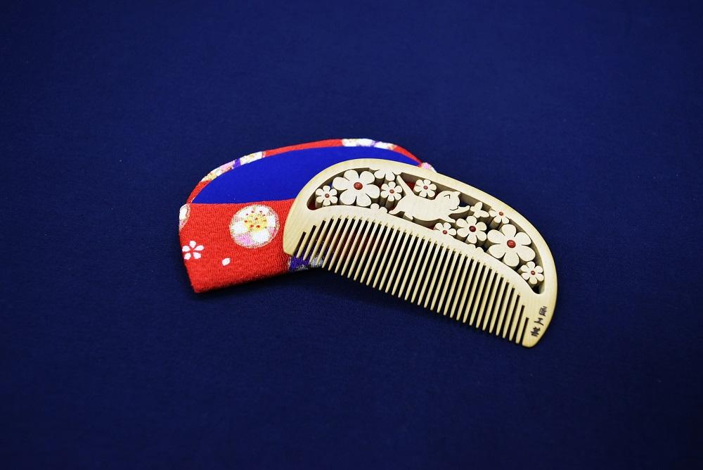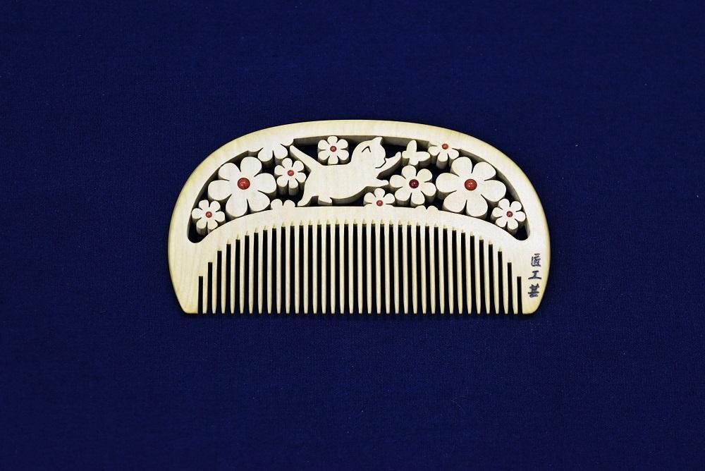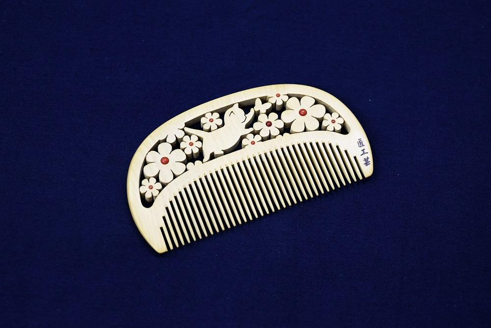 昔から日本人に馴染みの深いつげの櫛に、最小0.16mmの糸鋸を駆使する独自の専門技術『透かし彫り』でお花畑でちょうちょを追いかけるかわいい子猫の柄を彫ってます。