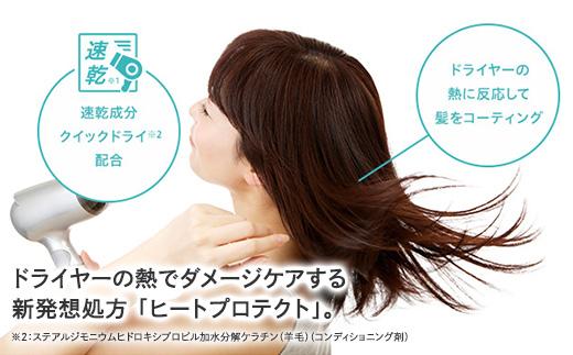 ドライヤーの熱に反応して髪を1本1本をコーティングしダメージ補修する「ヒートプロテクト※1」配合。