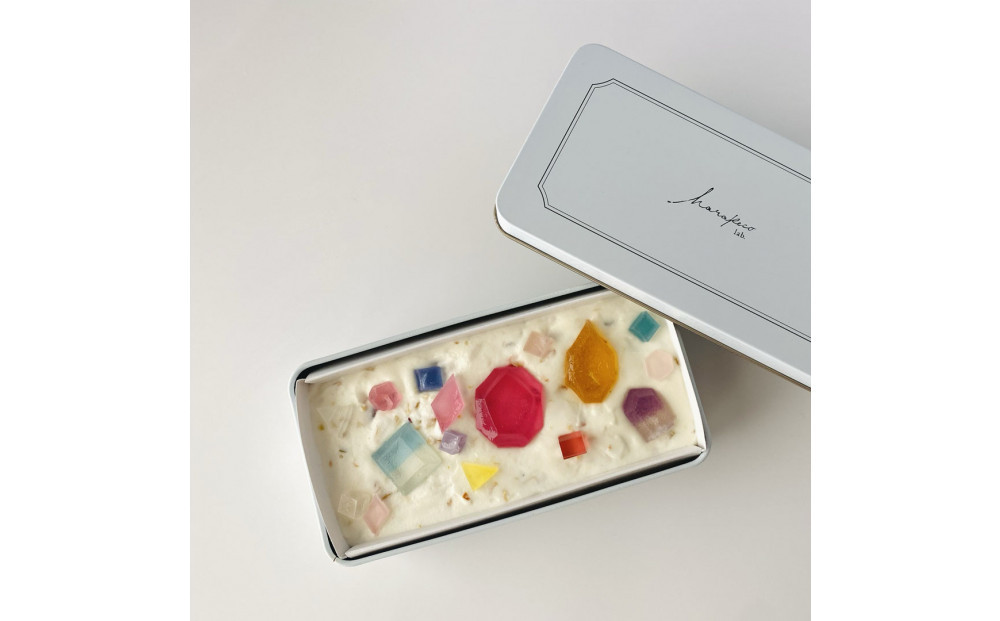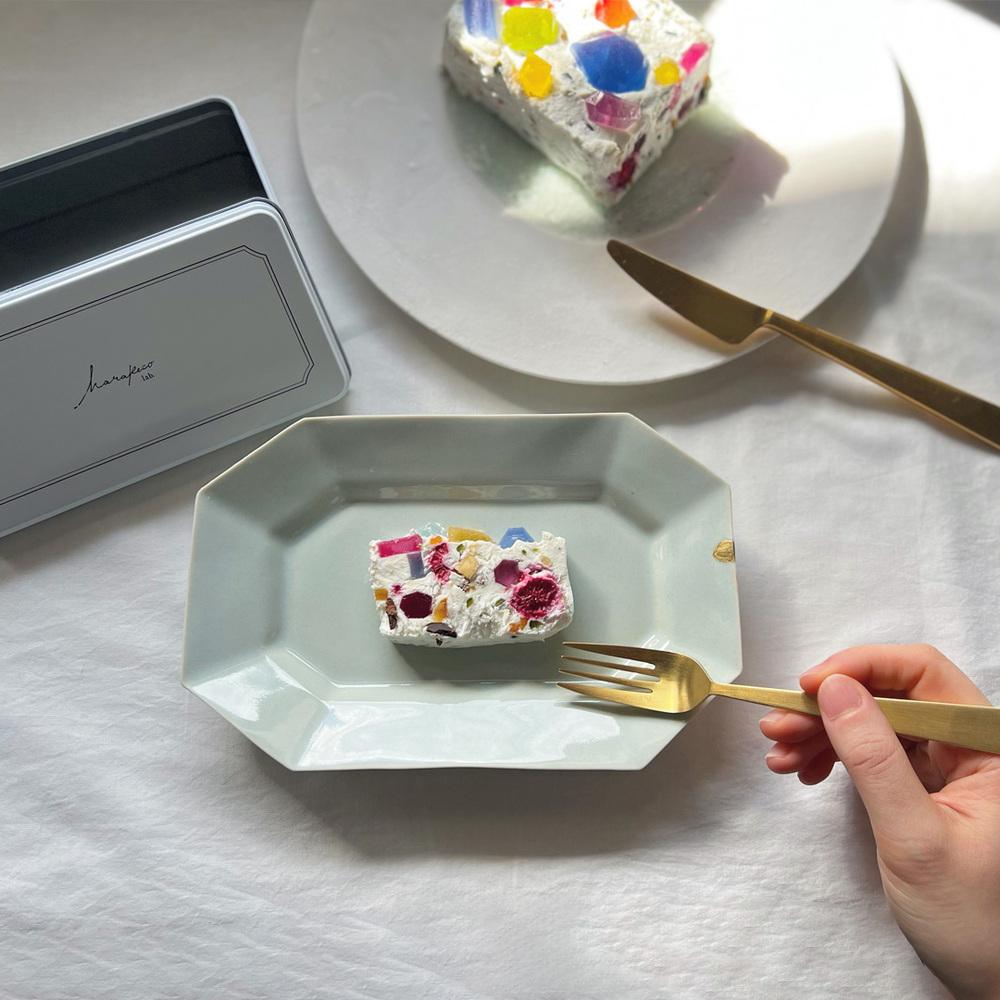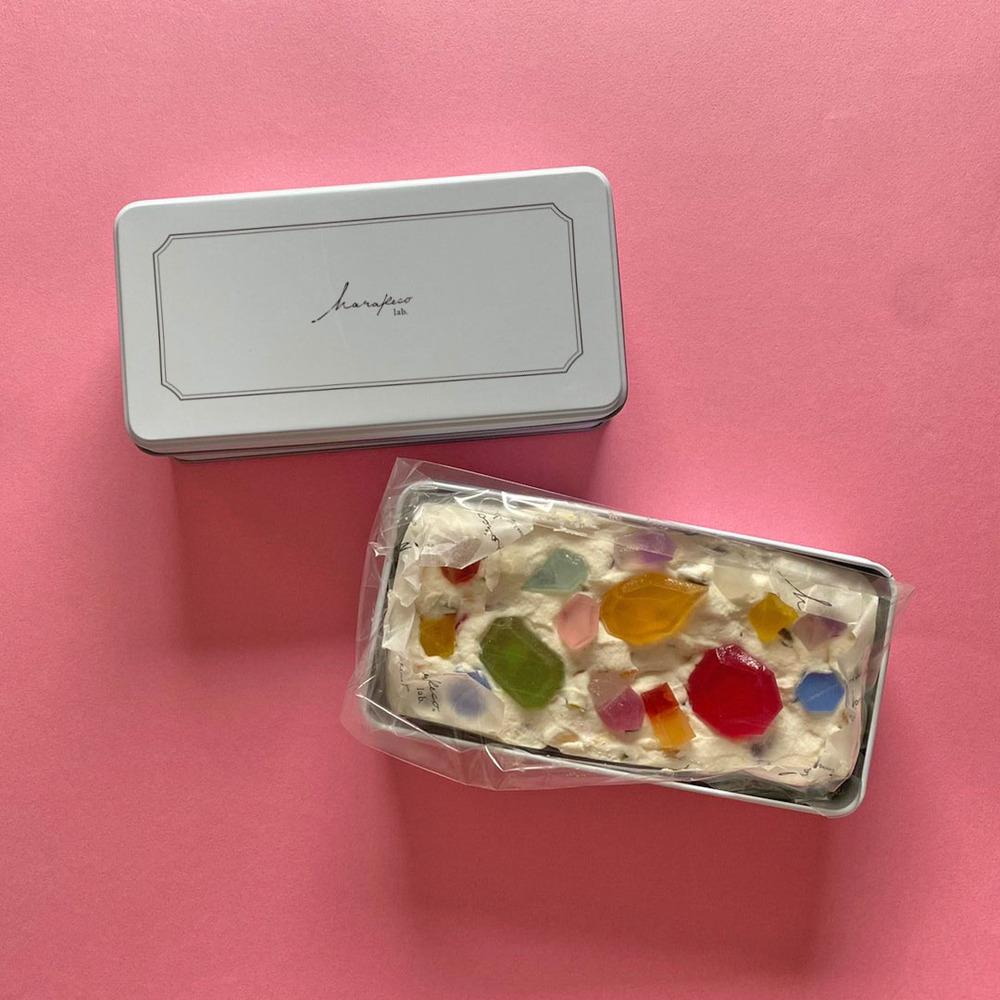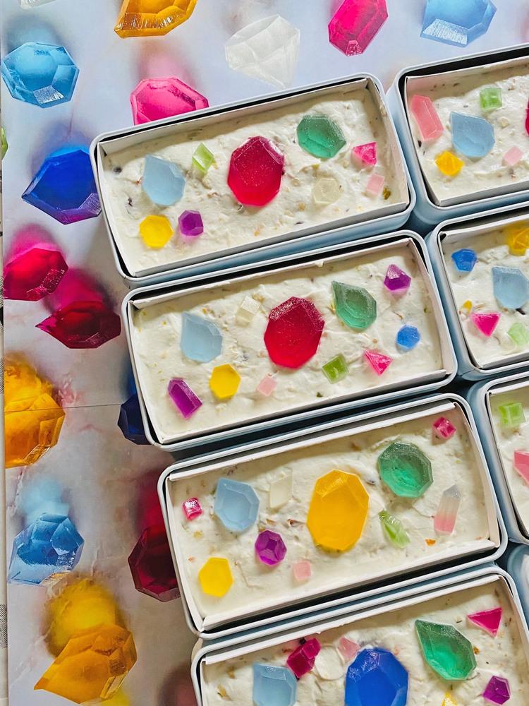 白いカッサータの中に、ハラペコラボが作る鉱物みたいな琥珀糖「こうぶつヲカシ」が隠れています。チーズとクリームの白に映える色味のこうぶつヲカシは、どこをカットしても断面が透明で光があたるとキラキラと輝く宝石のように美しい仕上がりになりました。