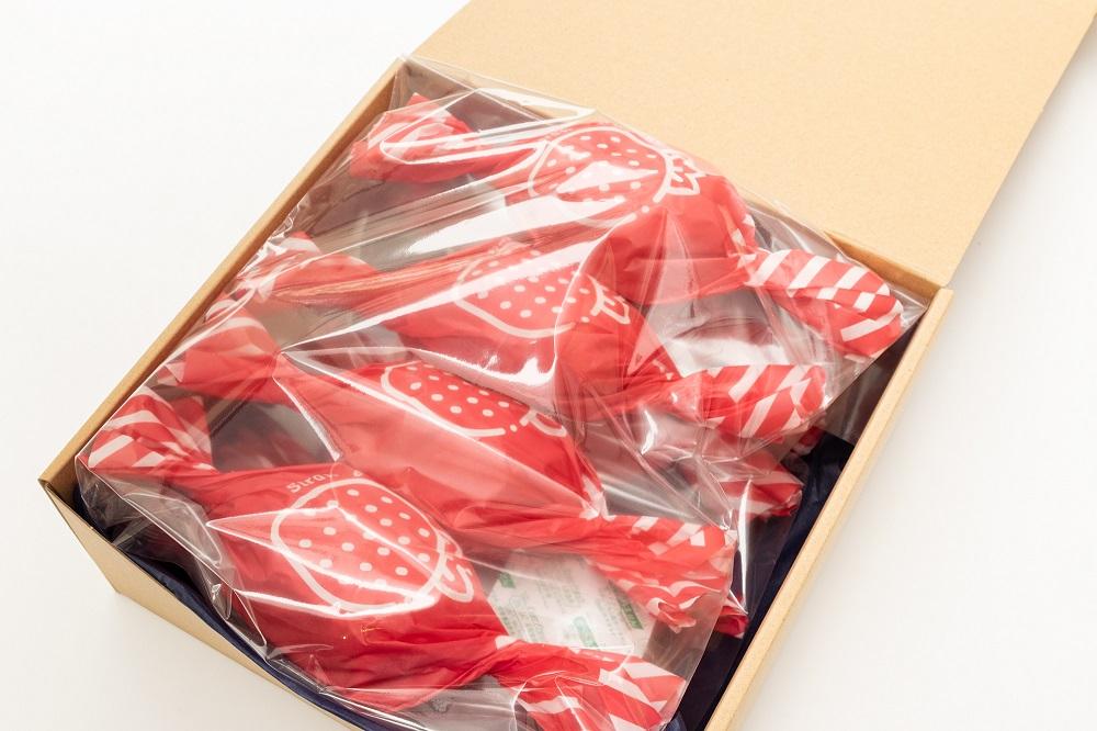 いちご模様のキャンディ型に包まれた、香り豊かなふわふわのいちごケーキ。