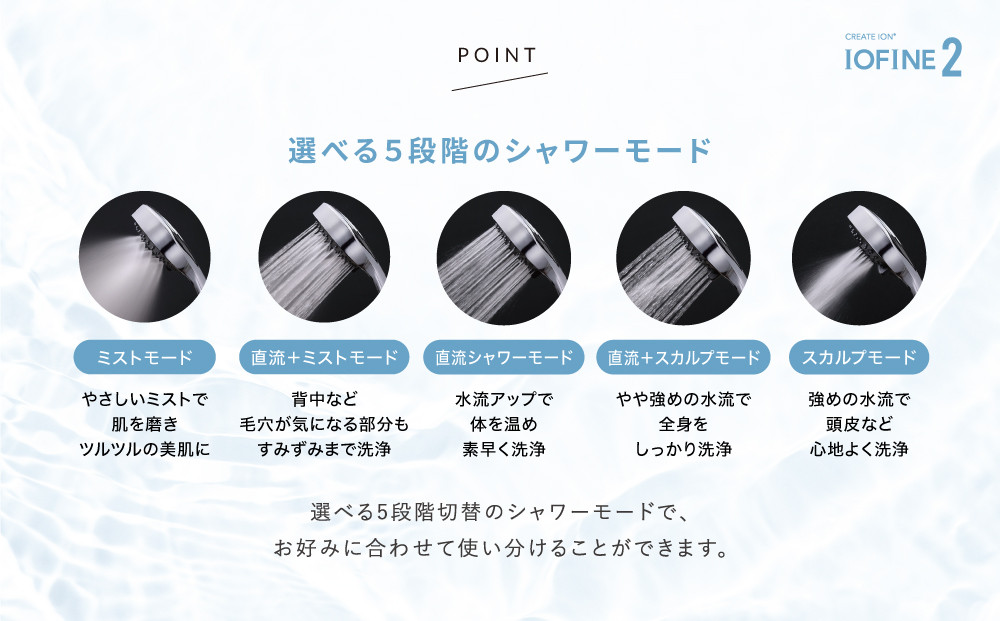1. 直流シャワー / 2. 直流シャワー+スカルプ / 3. スカルプ / 4. ミスト / 5. 直流シャワー+ミスト