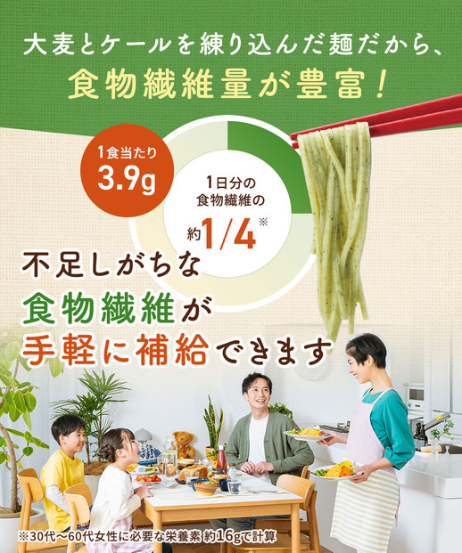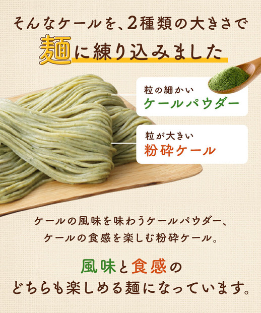 自社で製粉した福岡県産小麦粉ラー麦をベースに、自社製粉の九州産大麦粉と青汁で有名なキューサイの国内産ケールを麺に練りこみました。食物繊維が豊富な「大麦」と栄養豊富な野菜の王様「ケール」が摂れる、からだにおいしい麺です。スープはこだわりのの液体スープ3種類、「あっさり塩・オリーブ味スープ」「ピリ辛みそ味スープ」「濃厚ごま・とんこつつけ麺スープ」。