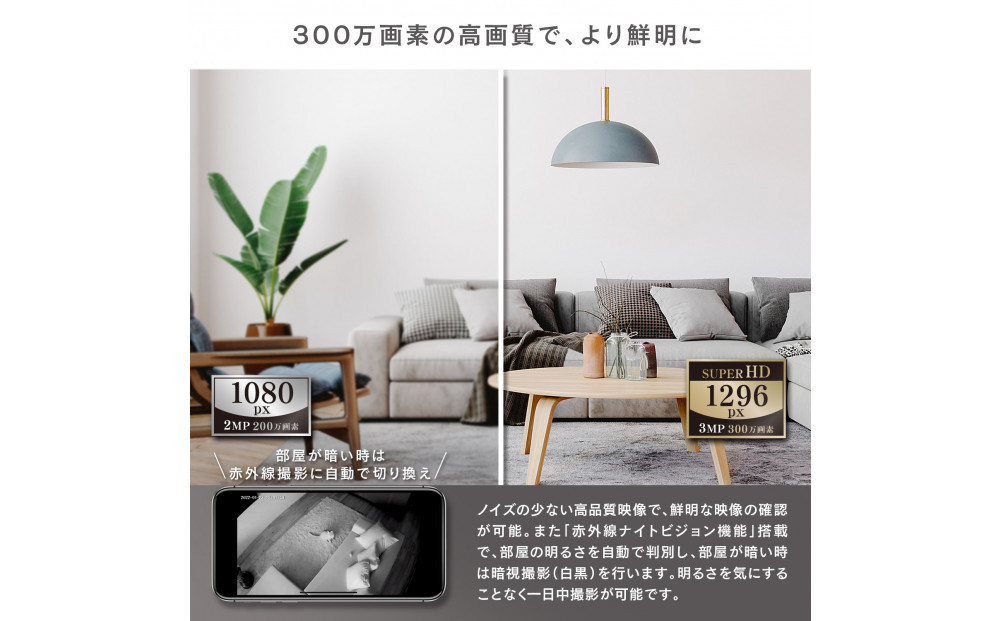 microSDカード録画(カード別売り)、クラウド録画(有料)、データ共有、スマートスピーカー(Alexa、GoogleHome対応)など、高機能システムを搭載しています。また、フルハイビジョンを上回るスーパーハイビジョン撮影が可能に!