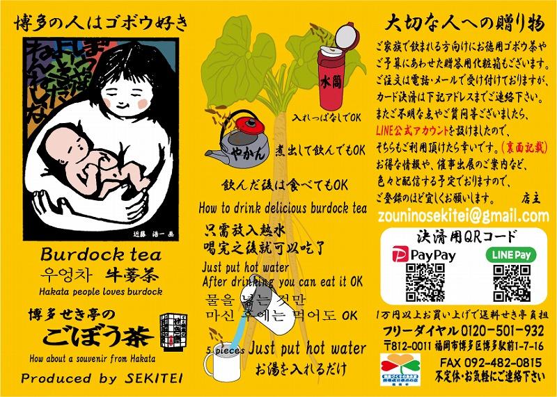 妻の出産を機に作った、雑煮のせき亭オリジナルのゴボウ茶。5枚くらい湯呑に入れてお湯を注ぐだけ。残ったゴボウも食べられます。お雑煮の主要原材料でもあるゴボウを、ゴボウ茶用に加工しました。※保存料等入っておりませんので、作り置きせずに、必要量だけおつくり下さい。 製造場所:福岡県福岡市博多区博多駅前 雑煮のせき亭 事業者 :雑煮のせき亭 連絡先 :092-451-1621