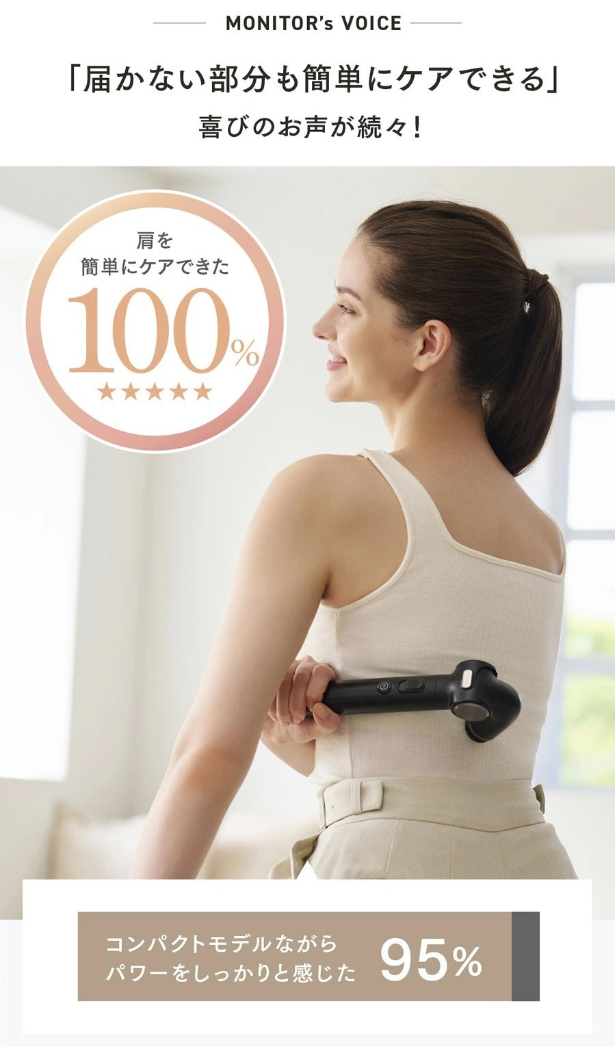 4段階の角度調整が可能なヘッドと背中まで届くハンドルで自由自在なセルフケアが可能に。 EXシリーズ最軽量の約336gなのにパワフルさはそのまま。 女性でも扱いやすい快適設計で、いつでも、思い立った時にボディケアを叶えます。 腰や背中などセルフケアが届きにくい箇所に、欲しい刺激を届けます。 事業者:創通メディカル 連絡先:092-260-7366 関連キーワード:美容家電 健康家電 日用品