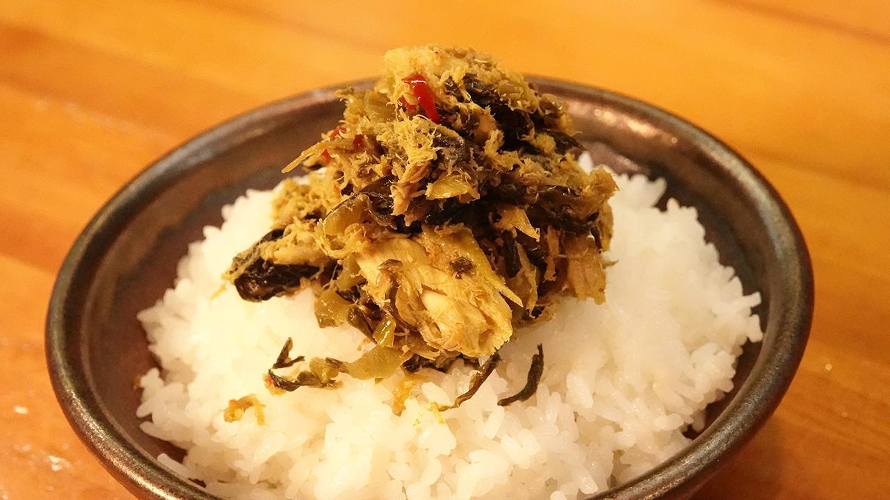 博多の名物高菜に焼きサバをたっぷりと混ぜ、創意工夫をこらして最高の一品が出来上がりました。