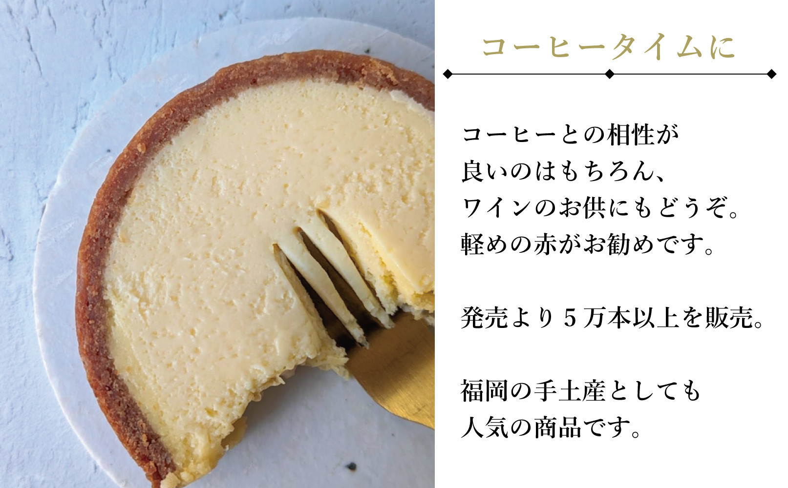 福岡県産大豆「フクユタカ」の豆乳を使用し濃厚ながらさっぱりとした口当たりが特徴。低温でじっくりと焼き上げてレアチーズのような滑らかさを実現。全て、パティシエが手作りしている自慢のチーズケーキです。