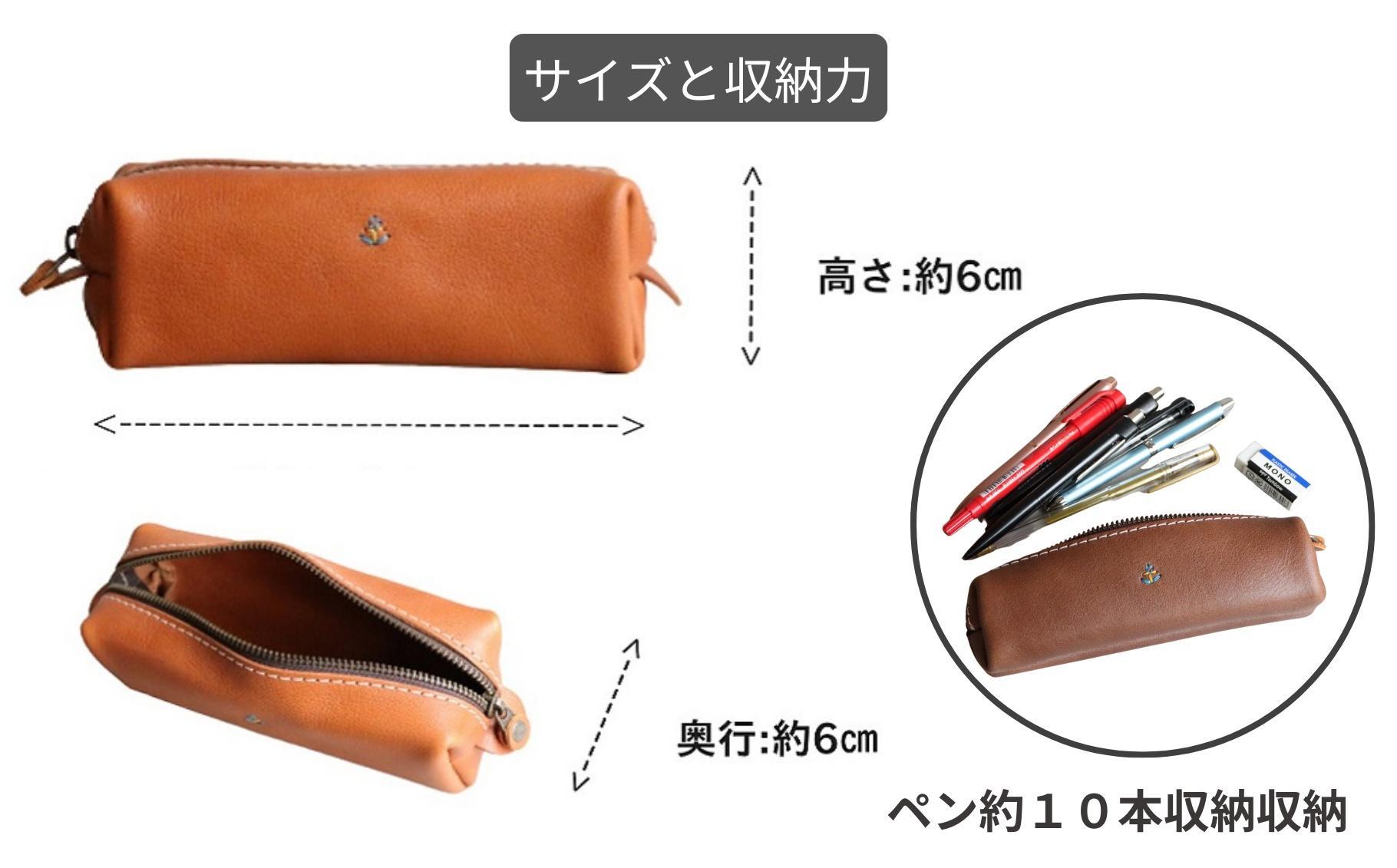 |サイズとスペック 幅17cm 高さ4cm 奥行4cm 重さ45 g(タマゴ1個分) ボールペン約10本・消しゴムを収納 ★ボールペン22本を収納できるMサイズも出品中 |全5カラー キャメル チョコ|人気No1 ブラック グリーン レッド ※色の選択欄が無い場合、検索窓で japlish と入力すると他の革色がご覧いただけます。 |素材について レザー:工房オリジナルのコンビ鞣し牛革。 裏地:無し(本革1枚仕立て) 金具:落ち着きのあるアンティーク鍍金加工品 糸:皮革製品専用ポリエステル製 |日々