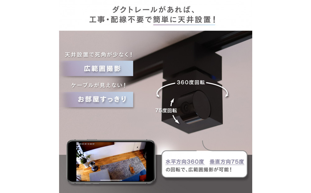 留守中の防犯対策(ホームセキュリティー)、赤ちゃんや子供用のベビーカメラ、職場や店舗の防犯カメラ、介護用のみまもりカメラ、猫や犬などのペット用カメラ、留守番カメラなどを天井設置したいけど、配線や天井への穴あけに抵抗がある方におすすめ。