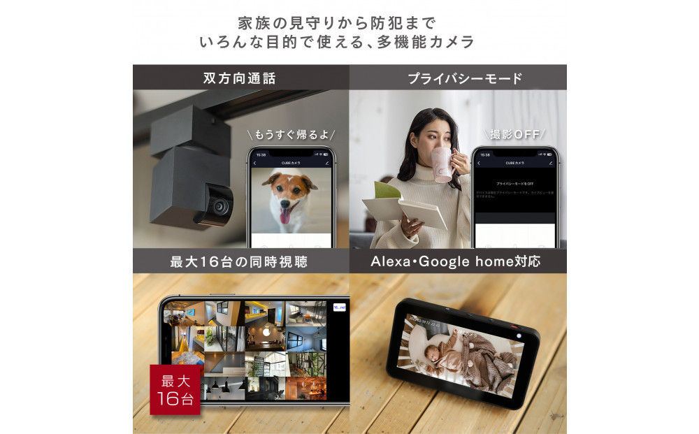 マットな質感の立方体のボディに、レンズ部分は艶のあるブラック。スマートカメラとしてはモダン・シンプルでかっこいい意匠で、「隠す」ものではなく「見せる」インテリアカメラとしてお部屋に飾れるアイテムです。コンパクトサイズなので、邪魔になりません。
