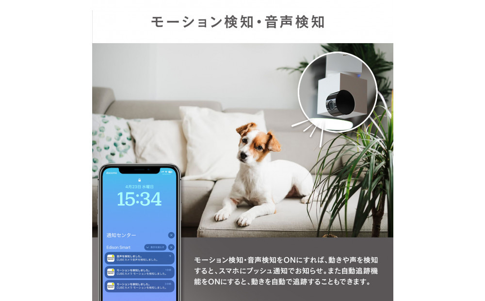 360度回転、自動追跡、モーション検知、音声検知、スマホプッシュ通知、双方向音声、プライバシーモード、暗視撮影(デイナイト機能)、タイマー設定、自動化設定、