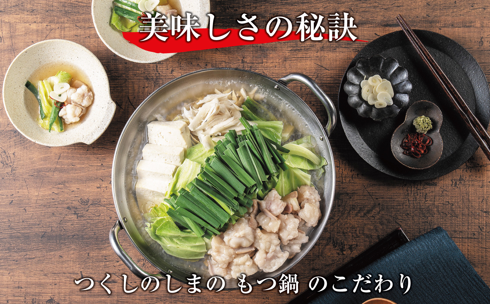 現在では、ニンニクの効いたみそ味やしょうゆ味などのもつ鍋が主流となる中、このもつ鍋は旨だし醤油味でだしの効いたもつ鍋です。かつおと・昆布のだしに程よく九州醤油の甘みを加え、一度飲むとまた飲みたくなるような日本人好みのだし。