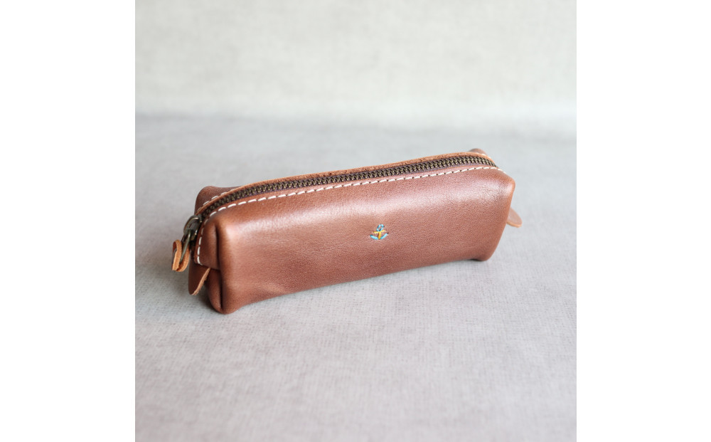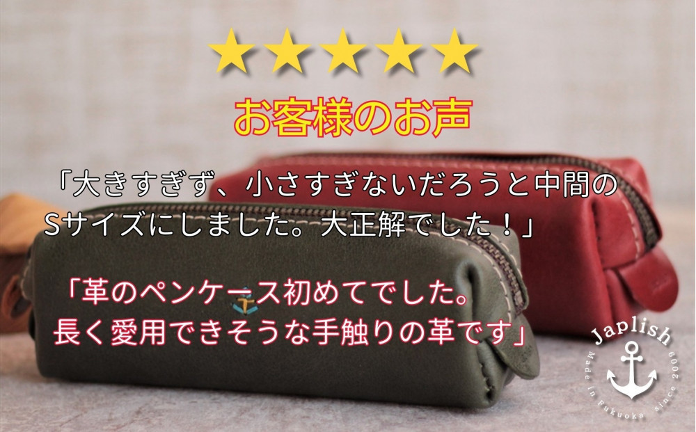 定番BOXペンケース【Sサイズ】 |製品サイズ・スペック 幅17cm 高さ5cm 奥行5cm 重さ70g(なす1本分) ★より小さい【XSサイズ】、ひとまわり大きい【Mサイズ】も出品中 ミシン糸色:本体革色問わず白糸(革製品専用糸) 手縫い刺繍:水色×黄色×水色(スウェーデン国旗カラー) 金具類:鉄(アンティークゴールド) 裏地:無し(本革1枚仕立て) ◆チョコ:落ち着いてなじみやすい色 ※色の選択欄が無い場合、検索窓で japlish と入力すると他の革色がご覧いただけます。 ※画像の色と実際の色に多