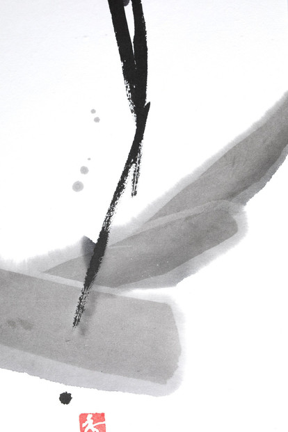 福岡市在住の墨象作家・香心(こうしん)による、黒田官兵衛をテーマにした「静かなる強さの系譜」シリーズ第2作目。墨象作品《慈影(じえい)》の原画です。