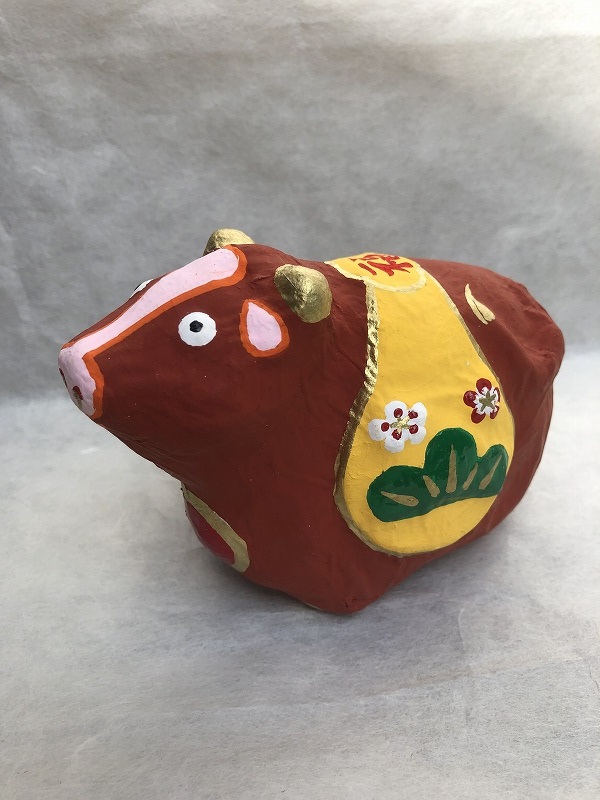 大きな赤牛がたくさんの福を背に乗せています。明るく楽しい一年を過ごせるよう、願いを込めております。