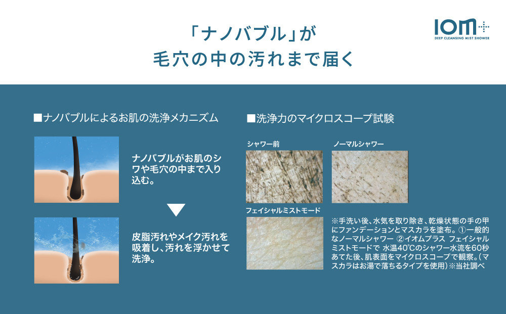 イオムプラスのミストシャワーから1mlあたり約2.38億個放出される大量の「ナノバブル」が、お肌のしわや毛穴の中まで届き、皮脂汚れやメイク汚れを吸着しながらしっかり洗浄。