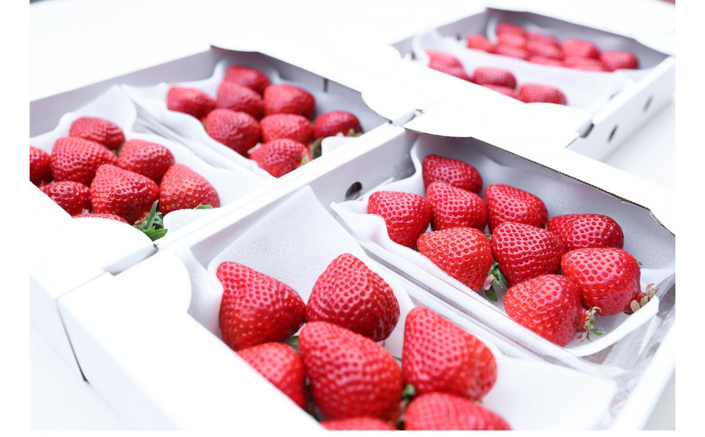 志賀島産の完熟あまおうを朝つみで、その日のうちに発送いたします。