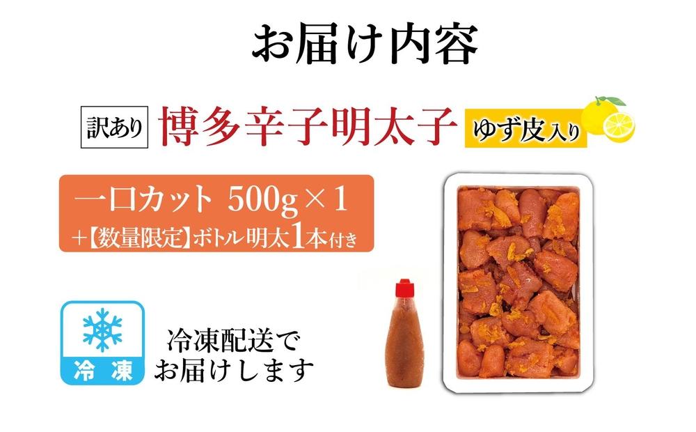 いまだけ数量限定!ゆず皮入りの辛子明太子に、ギュッと絞ってそのまま白いご飯にはもちろんアレンジ料理にも使えるボトル入り明太子が1本(230g)付いてきます!