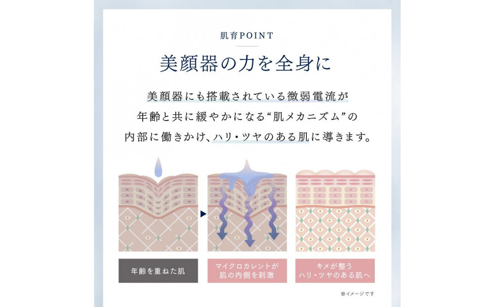 美顔器にも搭載されている微弱電流が年齢と共に緩やかになる“肌メカニズム”に働きかけ、内側から美しさをサポート。