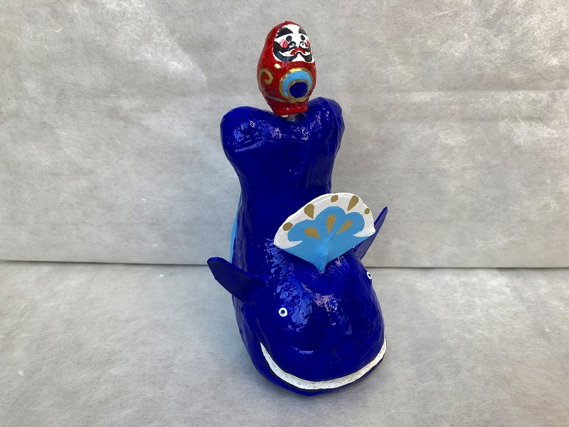 江戸時代に、博多湾に鯨が入り、博多の街を潤したとの言い伝えにあやかり、鯨がだるまと一緒に福を届けます。