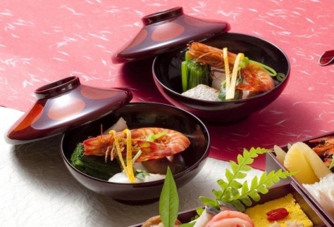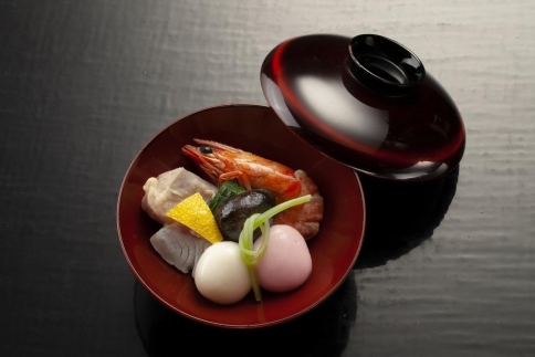 正月をはじめお祝いの時に食べる博多の雑煮椀。上質な鰹節と昆布で取ってた料亭ならではのお出汁。博多の雑煮椀には、紅白の小餅が入り風味豊かでまろやかな出汁にブリや鶏肉、車海老の旨みが加わった逸品。