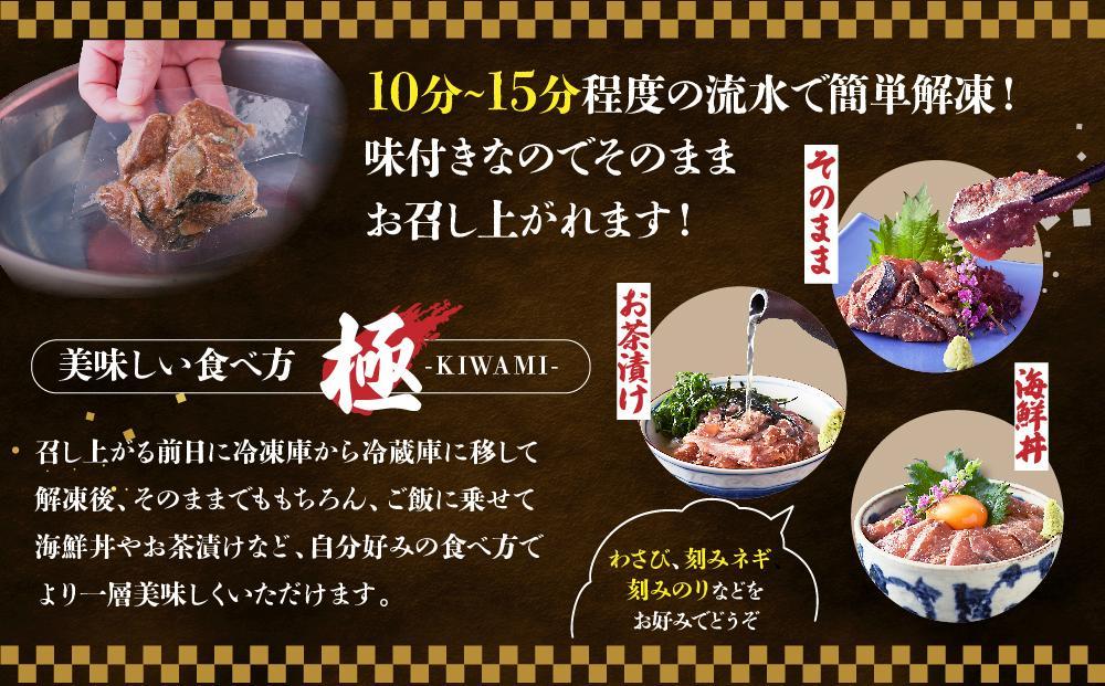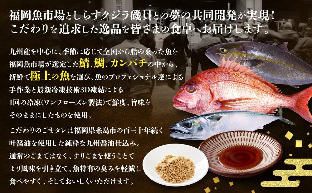 九州産を中心に、季節に応じて全国から脂の乗った魚を福岡魚市場が選定した鯖、鯛、カンパチの中から、新鮮で脂のった極上の魚を選び、魚のプロフェショナル達による手作業と最新冷凍技術3D凍結による1回の冷凍(ワンフローズン製法)で鮮度、旨味をそのままにしたものを使用。